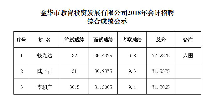 金華市教育投資發展有限公司2018年會計招聘綜合成績公示