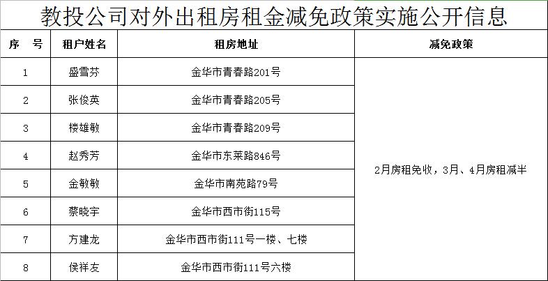 根據(jù)省、市及市社發(fā)集團(tuán)相關(guān)通知要求,現(xiàn)將市教投公司出租房租金減免政策實(shí)施情況公開如下: