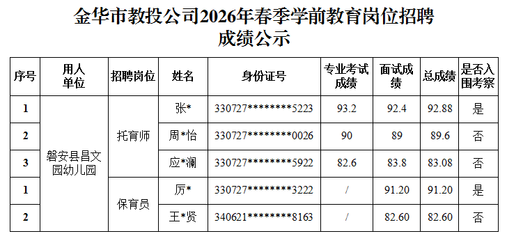 金華市教投公司2026年春季學(xué)前教育崗位招聘成績公示